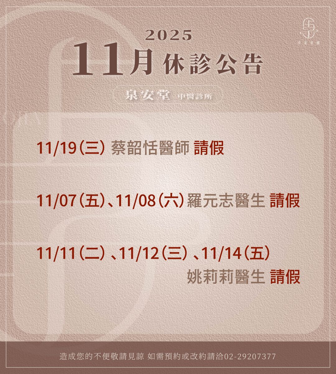 【十一月休診公告】 ⚑泉安堂中醫診所