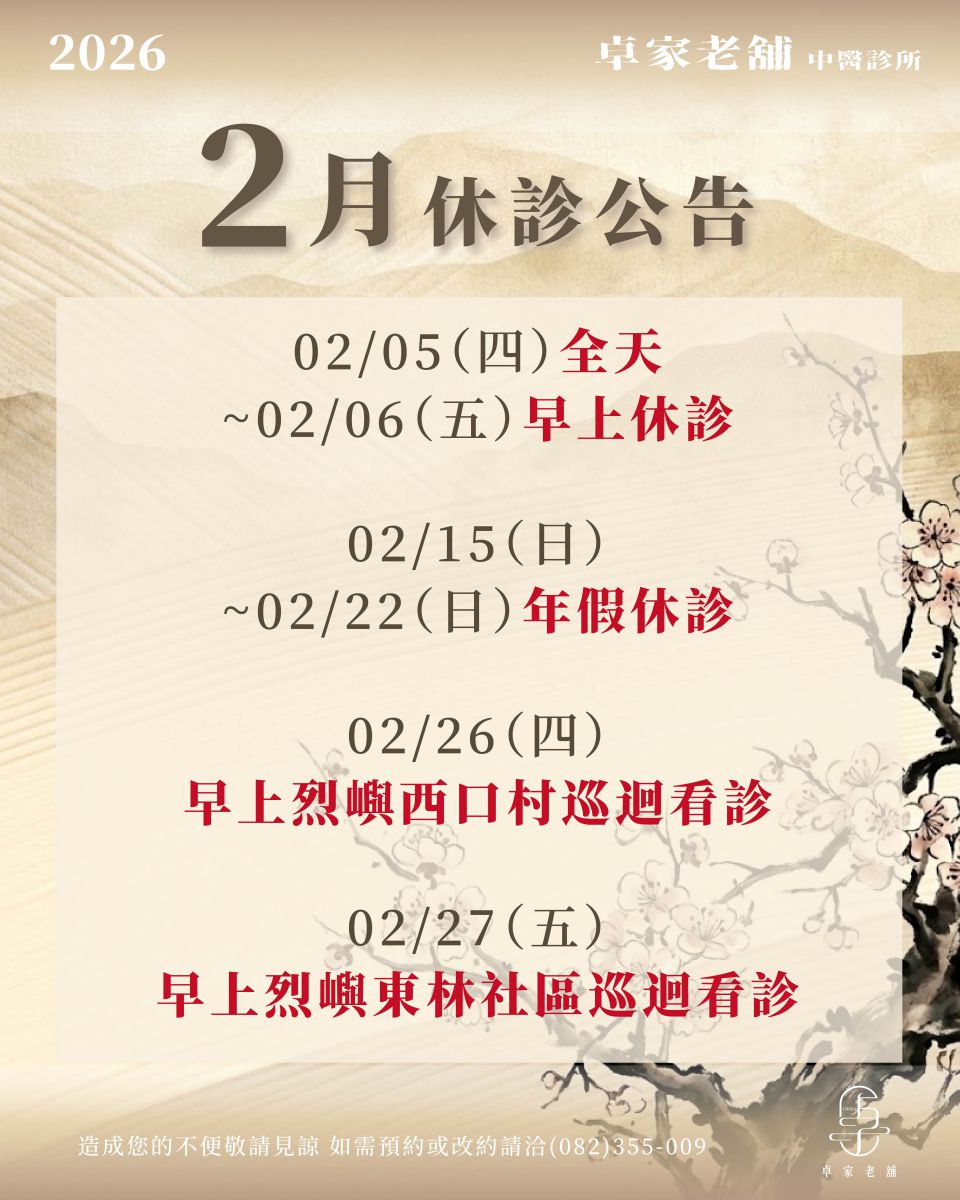 【二月休診公告】 ⚑卓家老舖中醫診所