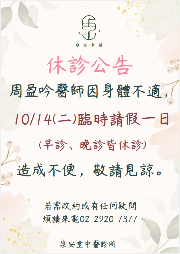 【10/14(二)周盈吟 醫師 臨時休診公告】