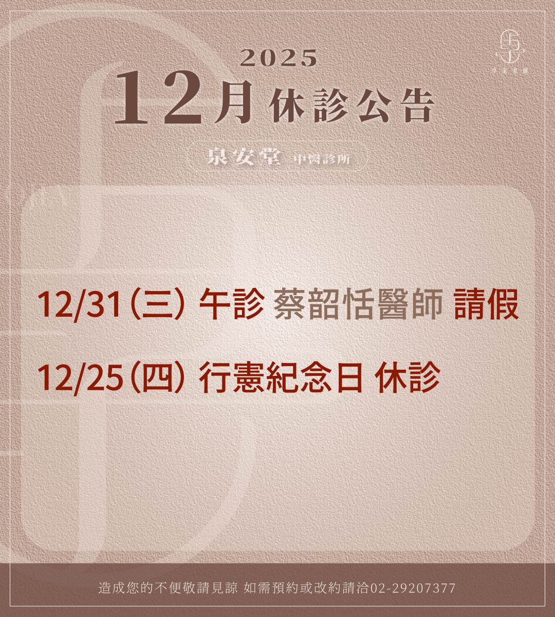 【十二月休診公告】 ⚑泉安堂中醫診所