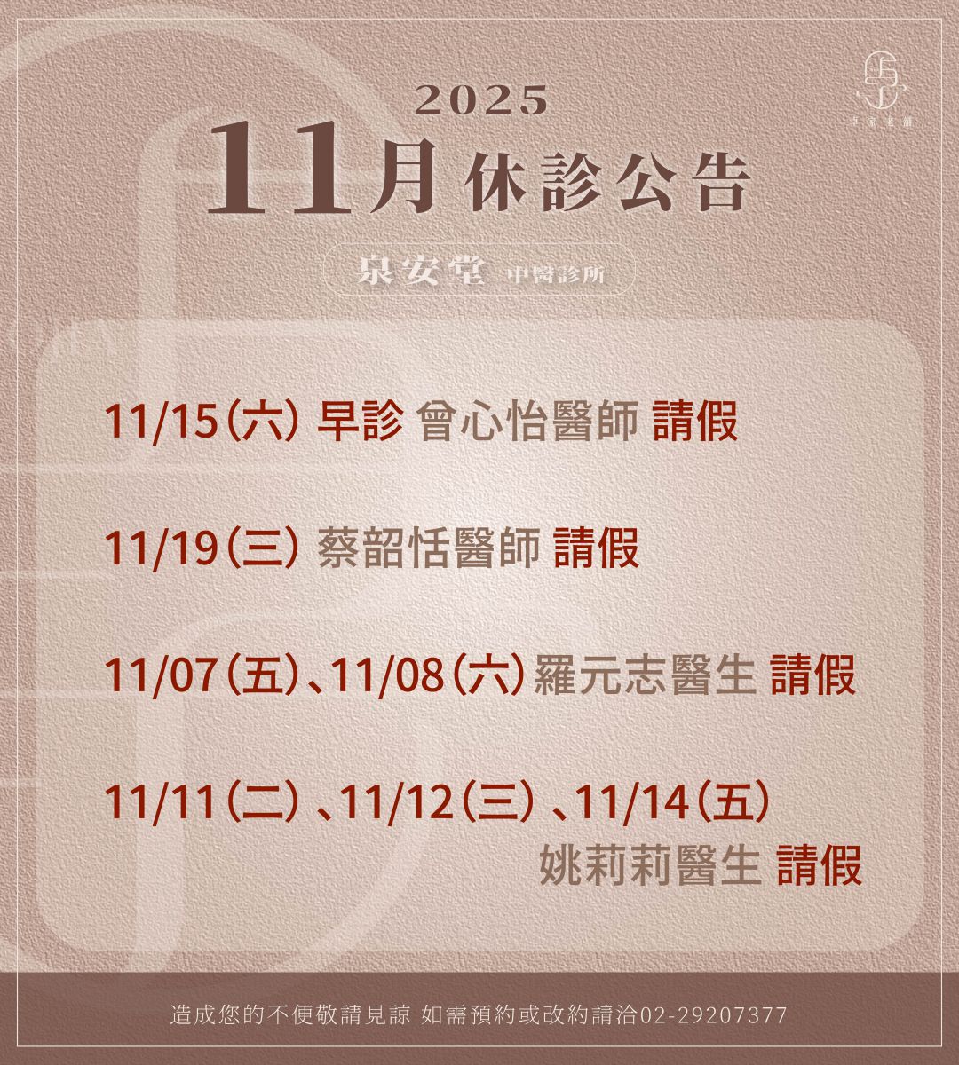 【十一月休診公告】 ⚑泉安堂中醫診所
